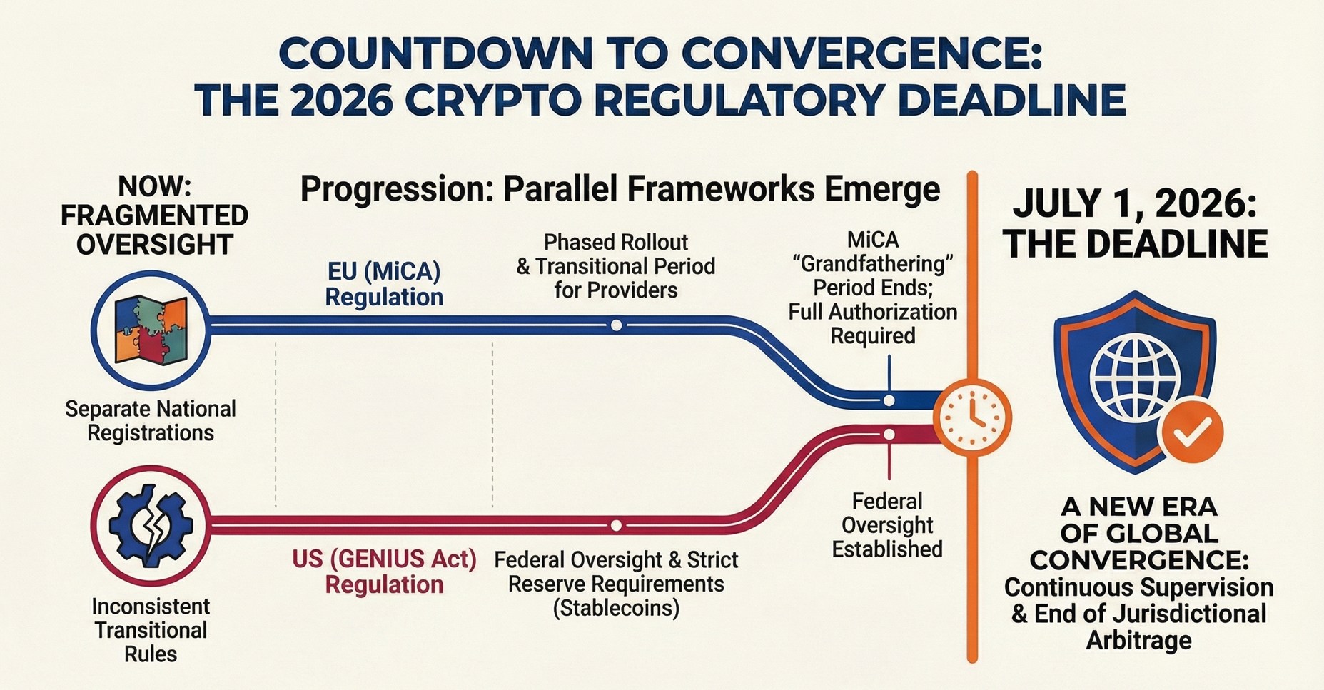 The period of time known as transitional grace that has permitted various VASPs to function under limited national registrations is announcing its end. In Europe, July 1, 2026, will mean the complete end of the “grandfathering” clause only under MiCA. Therefore, from this time forth, any crypto-asset service provider that wishes to function in the EU will have to go through the full authorization process, resulting in the regulatory movement from onboarding to activity, supervision that is active and intrusive.